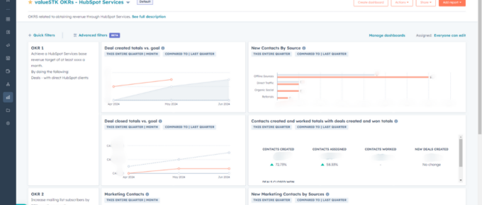 Creating an OKR Dashboard in HubSpot is both a visual and useful way to track ongoing progress on our objectives. When those objectives are revenue goals or customer engagement goals, then the measurable tactics often correlate to activities we do on HubSpot.